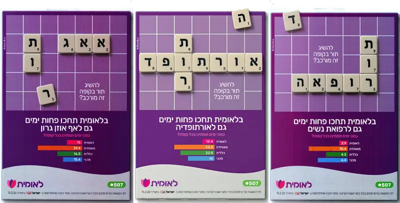 חשוב לציין השבוע את עבודת הקריאייטיב של משרד הפרסום 'בריליאנט' עבור 'לאומית שירותי בריאות'. הם זיהו את נקודת הכאב המרכזית- זמני ההמתנה לרופאים מומחים. במודעות הם מציגים לוח של משחק 'שבץ-נא' עם מילים כמו 'אורתופדיה' או 'רופאה', יחד עם המילים: "להשיג תור בקופה זה מורכב? בלאומית תחכו פחות ימים". בתשדיר שומעים שאלה: "רפואת העצמות והשרירים, תשע אותיות", והתשובה "אורטופדיה" נשלפת בשנייה המהירות שבה החידה נפתרת נועדה להעביר למאזין את המסר שגם התורים שלהם מהירים והסלוגן החדש על הלחן המוכר הוא "בבריאות לא מחכים – לאומית".