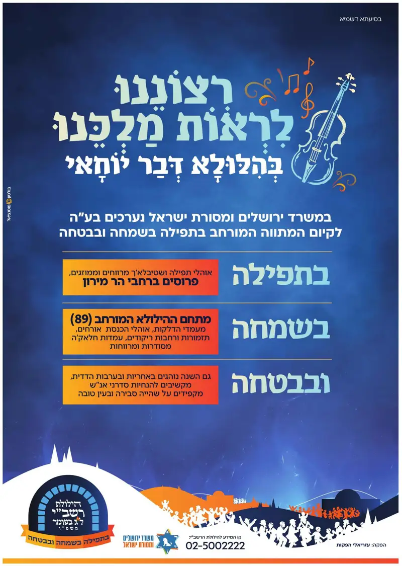 הנושא הכי "בוער" ומדובר בציבור החרדי בימים אלה הוא העלייה למירון. פיקוד העורף עדכן שישנה הגבלה של 1,500 איש בלבד, בעקבות חשש שארגון הטרור חיזבאללה ינסו לירות טילים דווקא ביום ההילולה של רבי שמעון בר יוחאי. המורכבות הלוגיסטית הכרוכה בפינוי המתפללים מההר אם תישמע שם אזעקה היא לא פשוטה. משרד ירושלים ומסורת ישראל, באמצעות משרד הפרסום 'בולטון פוטנציאל'. יצאו בקמפיין כבר בשבוע שעבר עם מודעות בעיתונות שמזמינות את הציבור להילולת הרשב"י במירון, תחת הכותרת המרגשת "רצוננו לראות מלכנו".