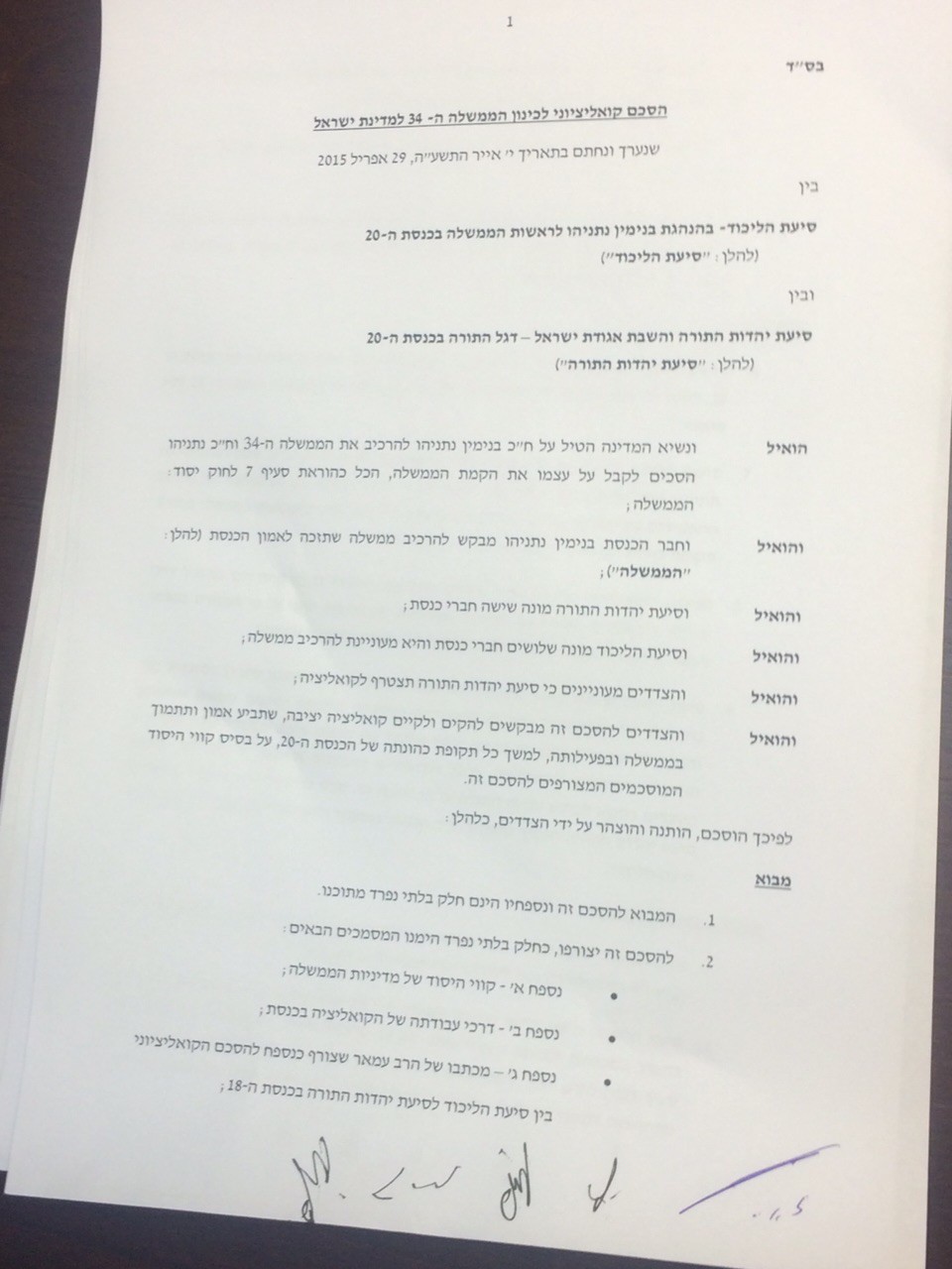 לאחר ששה שבועות של מו"מ מתיש נחתם הערב ההסכם הקואליציוני הראשון של הליכוד עם מפלגת יהדות התורה כאשר מיד לאחריו נחתם ההסכם עם כולנו.רה"מ בנימין נתניהו במעמד החתימה על ההסכם הקואליציוני עם מפלגת "יהדות התורה":