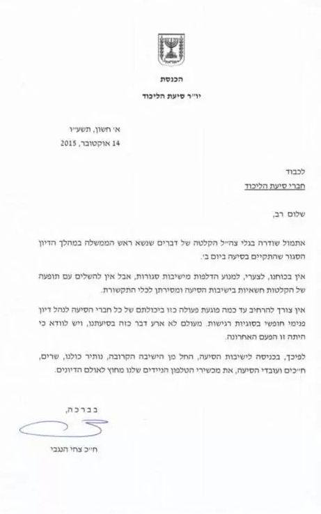 "אין צורך להרחיב עד כמה פוגעת פעולה כזו ביכולתם של כל חברי הסיעה לנהל דיון פנימי חופשי בסוגיות רגישות, מעולם לא אירע דבר כזה בסיעתנו ויש לוודא כי היה זו הפעם האחרונה". כותב יו"ר הסיעה ומסיים "לפיכך, בכניסה לישיבות הסיעה, החל מן הישיבה הקרובה, נותיר כולנו, שרים, ח"כים ועובדי הסיעה, את מכשירי הטלפון הניידים שלנו מחוץ לאולם הדיונים".