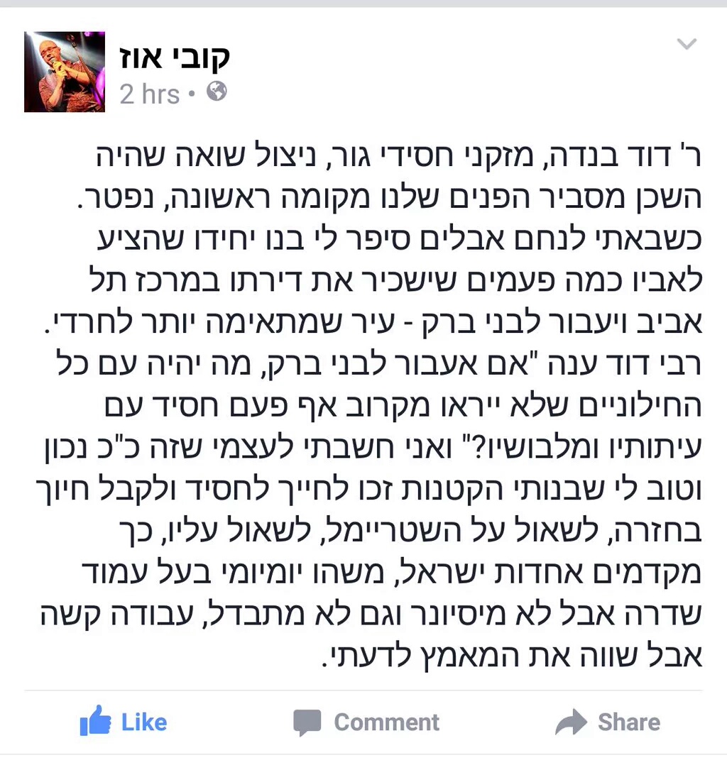 קובי אוז הוא הוא זמר, פזמונאי, מלחין, מוזיקאי, סופר ומפיק מוזיקלי ישראלי והוא מתגורר בתל אביב. השבוע הוא נפרד משכנו, ר' דוד בנדה ז"ל, מחסידי גור בתל אביב שהלך לעולמו בגיל 84.