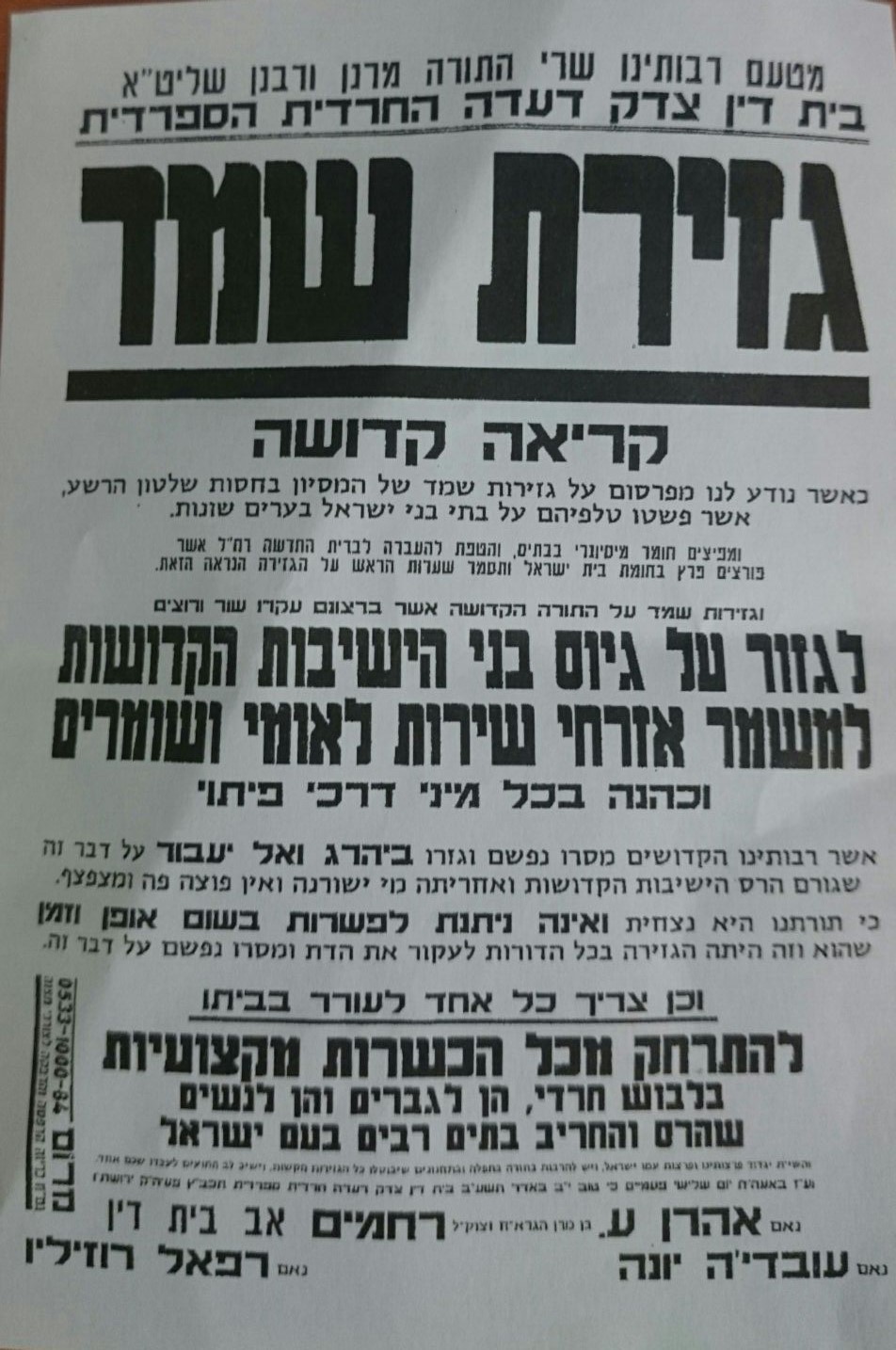 ההתנגדות לחוק הגיוס החדש לא מנת חלקם של אנשי הפלג הירושלמי בלבד. גם העדה החרדית הספרדית יוצאת חוצץ נגד החוק הגיוס ומפרסמים קול קורא תחת הכותרת "גזירת שמד".