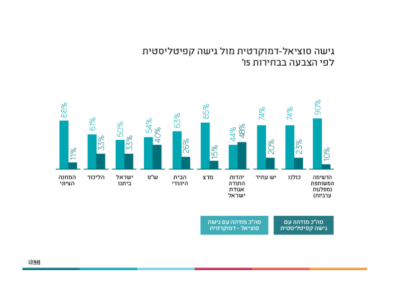 בסקר שנערך על ידי 'מדגם' פולחו הנסקרים על פי הצבעתם בבחירות האחרונות לכנסת, באופן שמשקף את עמדותיהם הפוליטיות. בשאלה עם איזה גישה הם מזדהים יותר, קפיטליסטית או סוציאל-דמוקרטית, היו מצביעי יהדות התורה היחידים בהם נמצא רוב שתומך בגישה הקפיטליסטית.