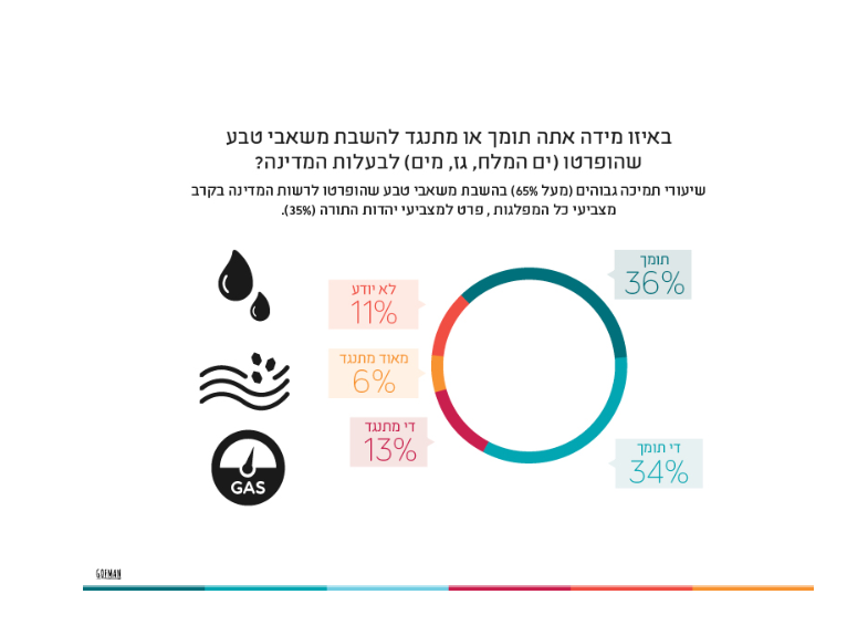 גם על השאלה באיזה מידה אתה תומך או מתנגד להשבת משאבי טבע שהופרטו (ים המלח, גז, מים) לבעלות המדינה, נמצאו מצביעי יהדות התורה בתחתית אחוזי התומכים בדרישה (35% בלבד), לעומת תמיכה גבוהה בקרב מצביעי כל המפלגות.