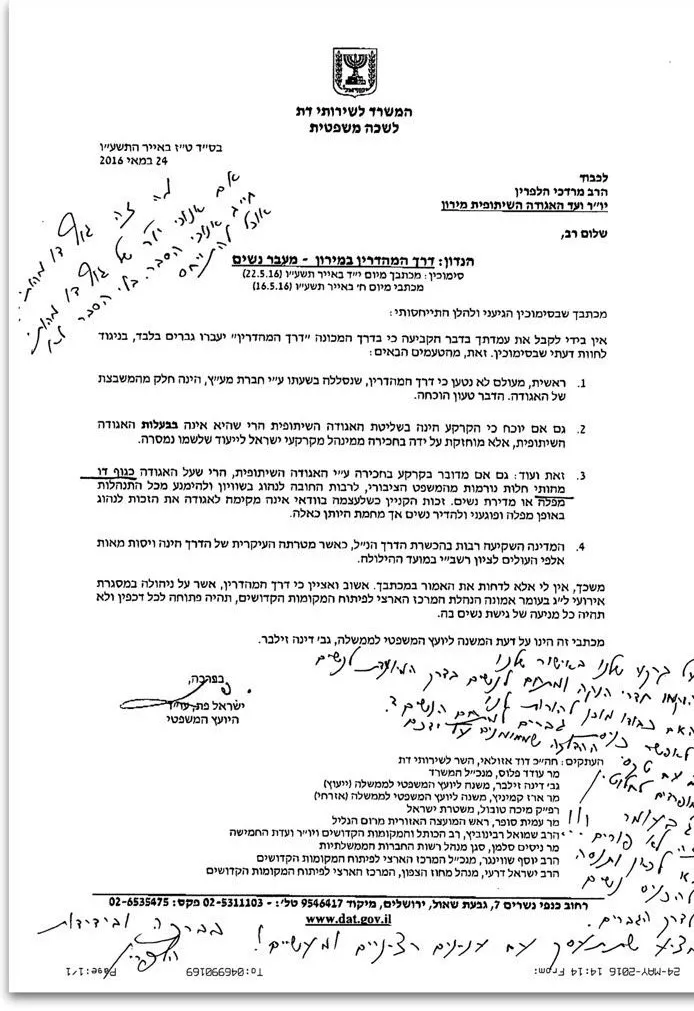שבוע אחרי שיו"ר וועד כפר מירון מרדכי הלפרין כי דרך המהדרין במירון היא בבעלות האגודה השיתופית וכי אין לאיש רשות להחליט עבור האגודה מה היא תשמש בא היום היועץ המשפטי של משרד הדתות עו"ד ישראל פת ומודיע להלפרין חד משמעי כי דרך המהדרין תיפתח גם לנשים.