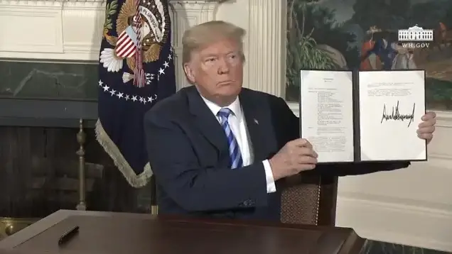 ולפיכך, אני מכריז היום כי ארצות הברית תצא מהסכם הגרעין האיראני. בעוד כמה דקות אני אחתום על מזכר נשיאותי אשר מודיע על סנקציות מחודשות אמריקאיות על המשטר האיראני. אנחנו מכריזים על הרמה הגבוהה ביותר של סנקציות כלכליות. כל מדינה שתעזור לאיראן להשיג נשק גרעיני תהיה גם נתונה לסנקציות.