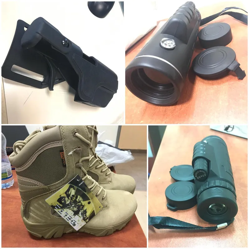 בין החבילות שאותרו על ידי קצין המת"ק: מיקרוסקופים דיגיטליים, כוונות לנשק, פנסים ונרתיקים לנשק, רחפנים, רכיבים אלקטרונים, טלפון שטח, מצלמות נסתרות, ציוד תקשורת, פנסי צלילה, נעליים צבאיות ועוד.
