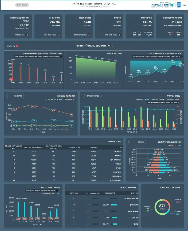 משרד הבריאות מעדכן הערב (שני) כי ביממה האחרונה התווספו 569 נדבקים מאומתים חדשים. בנוסף, 21,012 תוצאות בדיקות התקבלו אתמול. ב-18 השעות האחרונות התווספו 43 נפטרים.