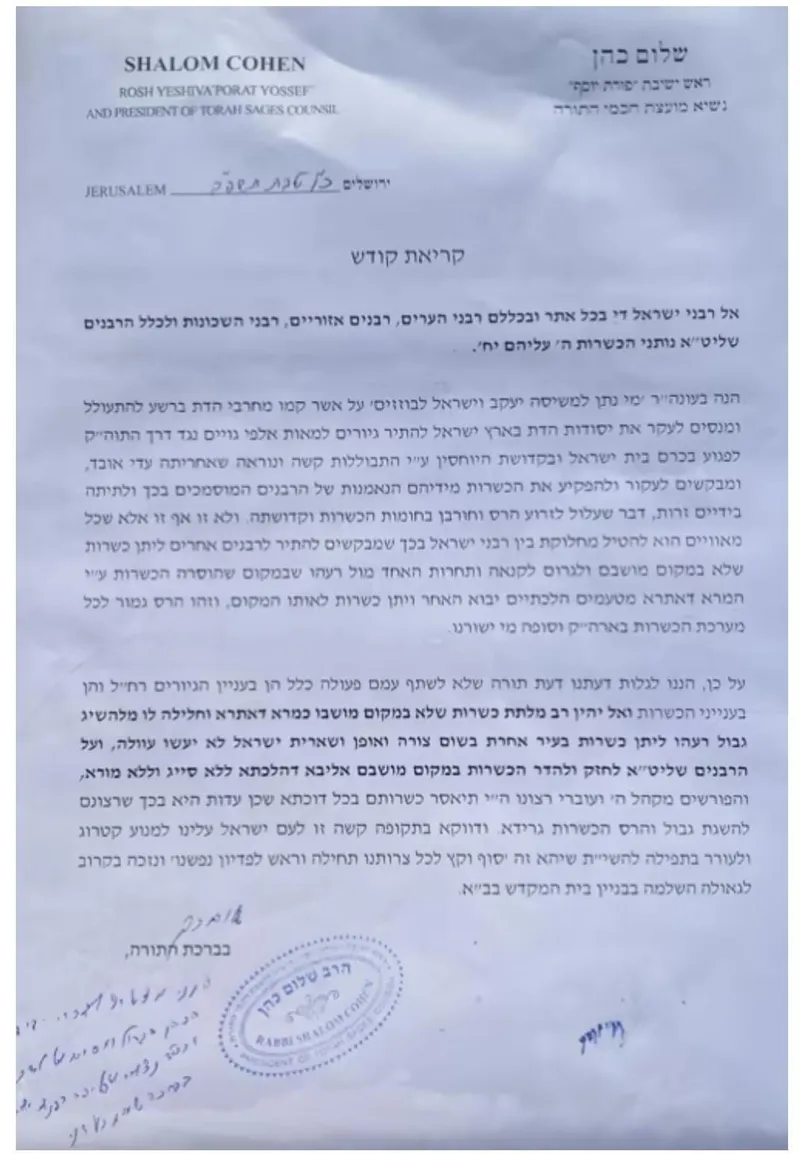 למכתבו של נשיא מועצת חכמי התורה מרן ראש הישיבה חכם שלום כהן הצטרפו מרן שר התורה הגר״ח קנייבסקי, מרן ראש הישיבה הגרי״ג אדלשטיין, וחבר מועצת חכמי התורה מרן הגר״ש בעדני.