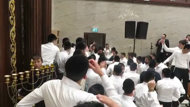 תיעוד ממסיבת חנוכה בהיכל ישיבת רכסים בהשתתפות כלל בחורי הישיבה לדורותיה בראשות ראש הישיבה הגאון רבי יצחק סופר וכלל רבני הישיבה