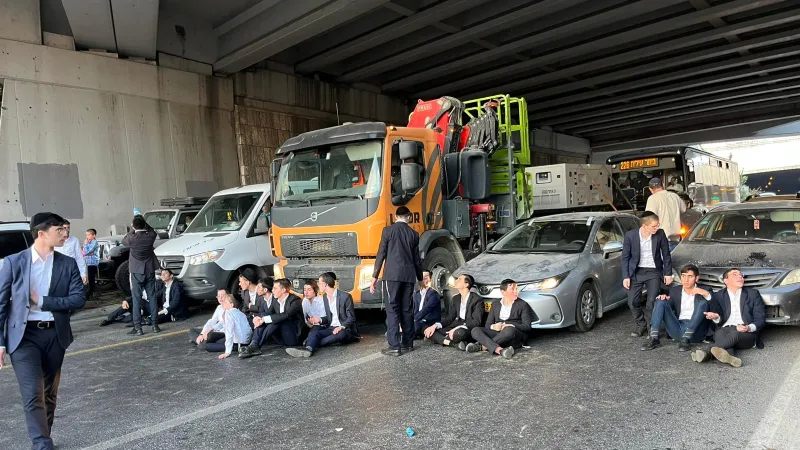 במחאה על גזירת הגיוס: צירי התנועה המרכזיים נחסמו לתנועה וגורמו לעומסים כבדים, בשעות שיא ההכנות לימי החג | הפלג: "עליית מדרגה חמורה בגזירת השמד והמשך התנכלותם של שלטונות הרשע ללומדי התורה"