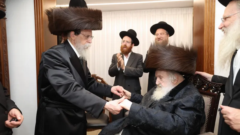 האדמו"ר מבאיאן ערך 'לחיים' לרגל נישואי נכדו במעונו של מרן הגר"מ שטרנבוך דוד הכלה וקם לרקוד עמו. צפו