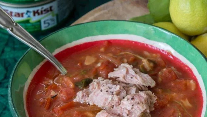 מתכון: מרק עגבניות, עם אורז, עשבי תיבול ונתחי טונה