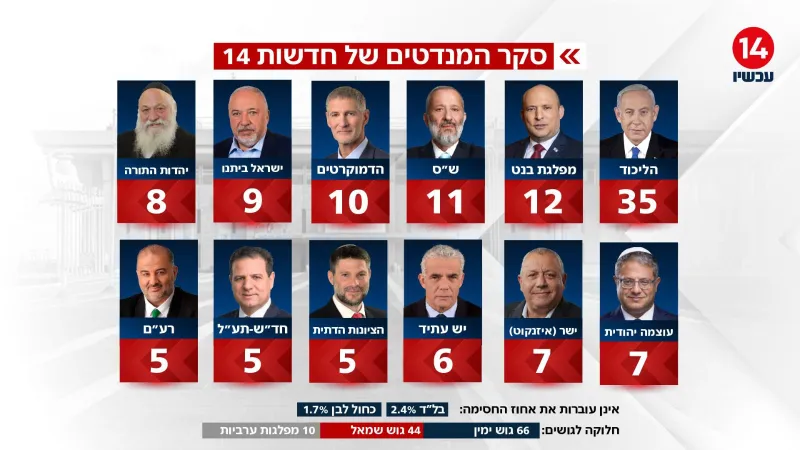 סקר חדשות 14 חושף: גוש הימין מוביל עם 65 מנדטים, הליכוד חזק עם 35, נתניהו מועדף לראשות הממשלה עם 54%
